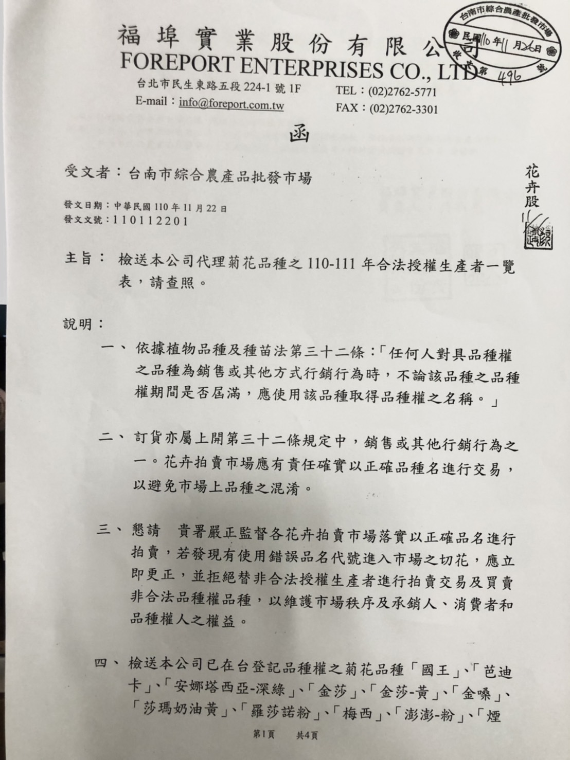 公告福埠菊花品種110-111年合法授權生產者函文1/4